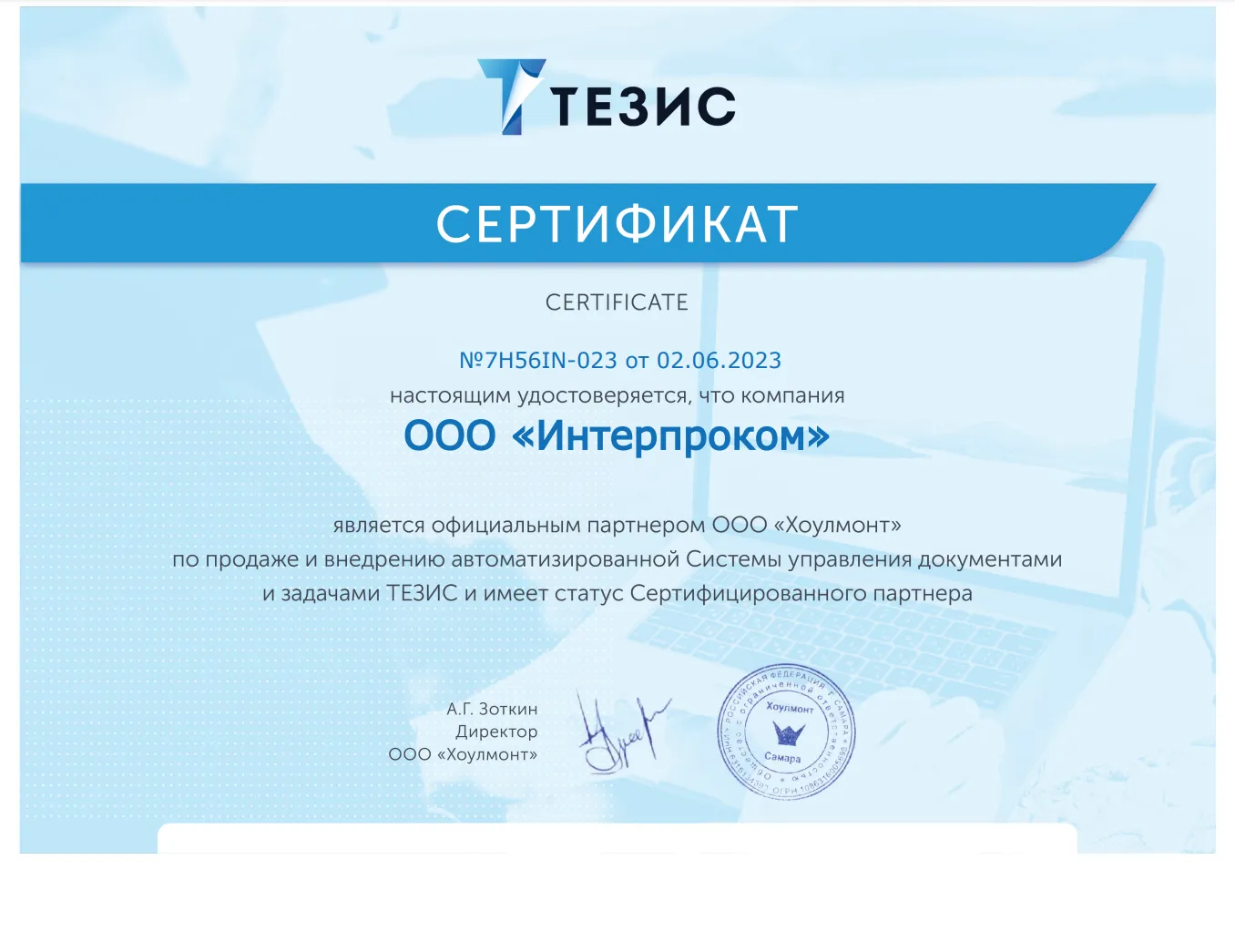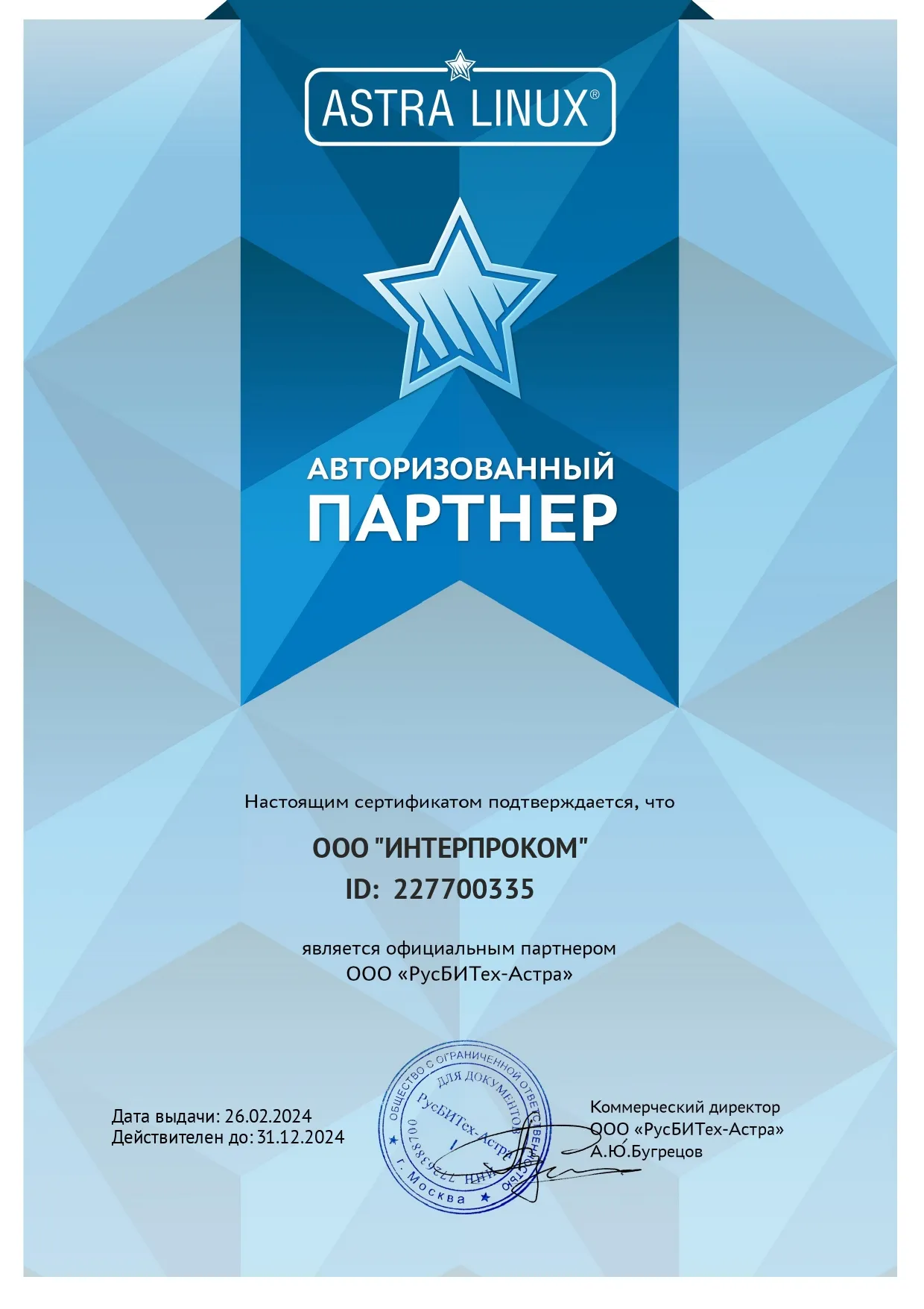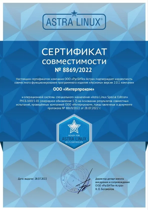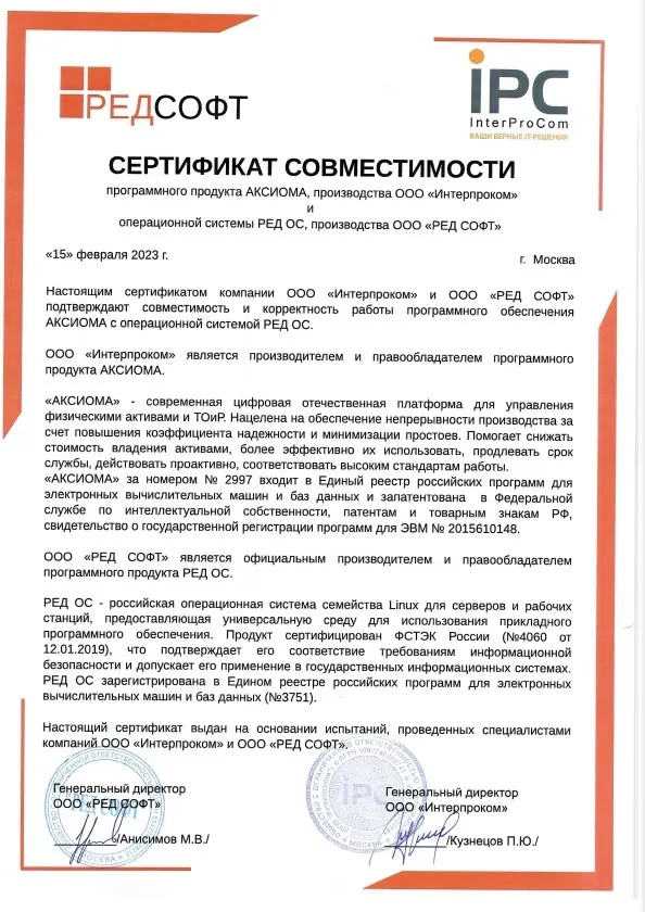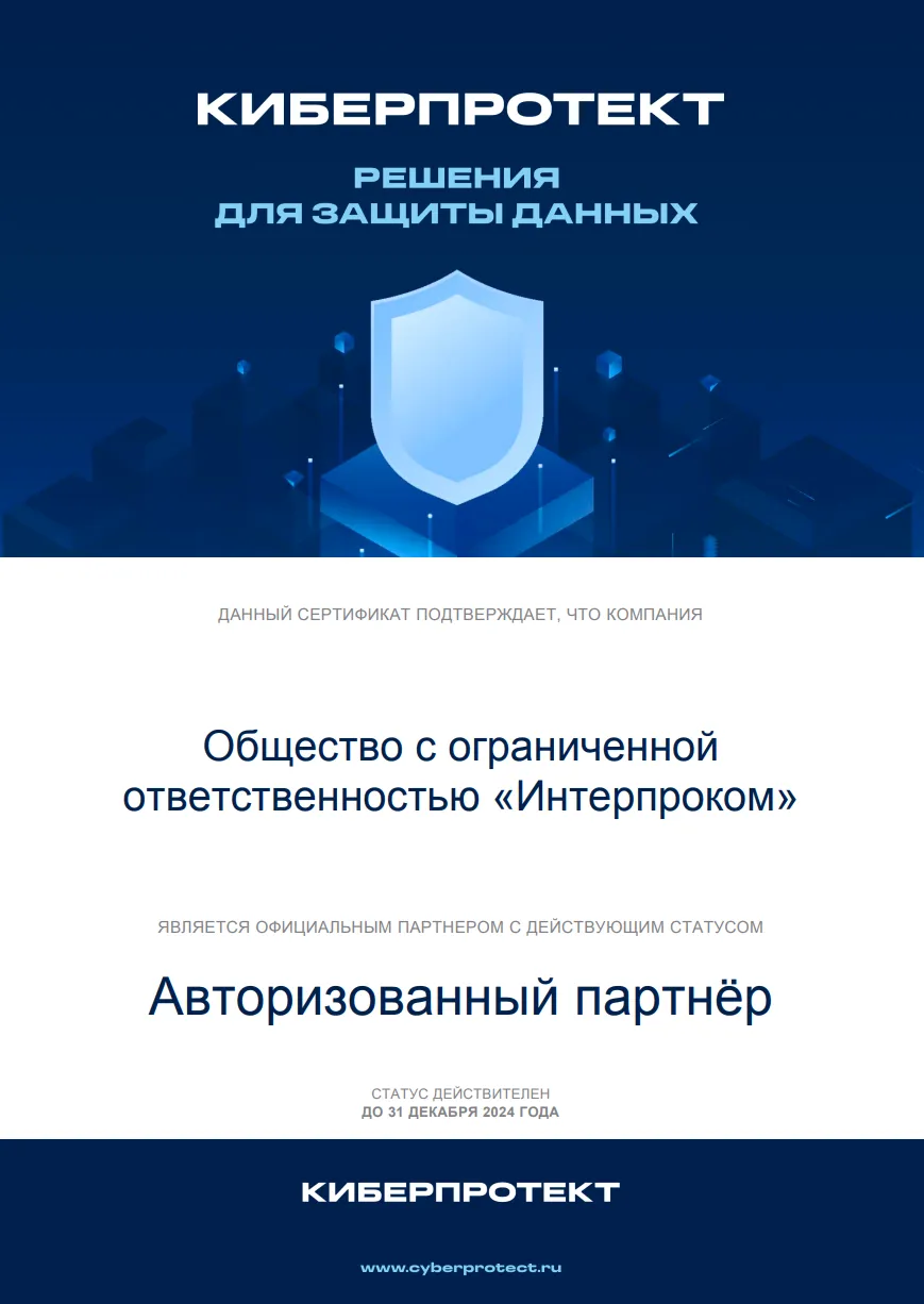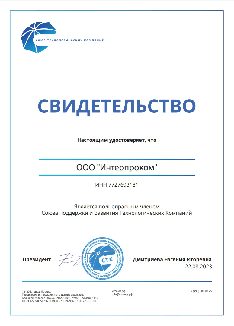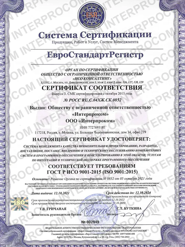 «Интерпроком» - одна из наиболее профессиональных команд страны по автоматизации управления бизнес-процессами, активами и ИТ-инфраструктурой. Наш опыт реализации крупных ИТ-проектов для частных компаний и для госучреждений и высокое качество нашей работы подтверждены многочисленными сертификатами, наградами и свидетельствами, в том числе сертификатом ФСТЭК на деятельность по технической защите конфиденциальной информации и сертификатом соответствия системы менеджмента качества требованиям ГОСТ ИСО 9001-2015 (ISO 9001:2015, 9001:2011, 9001:2008). Наши собственные разработки включены в государственный реестр программ для ЭВМ.