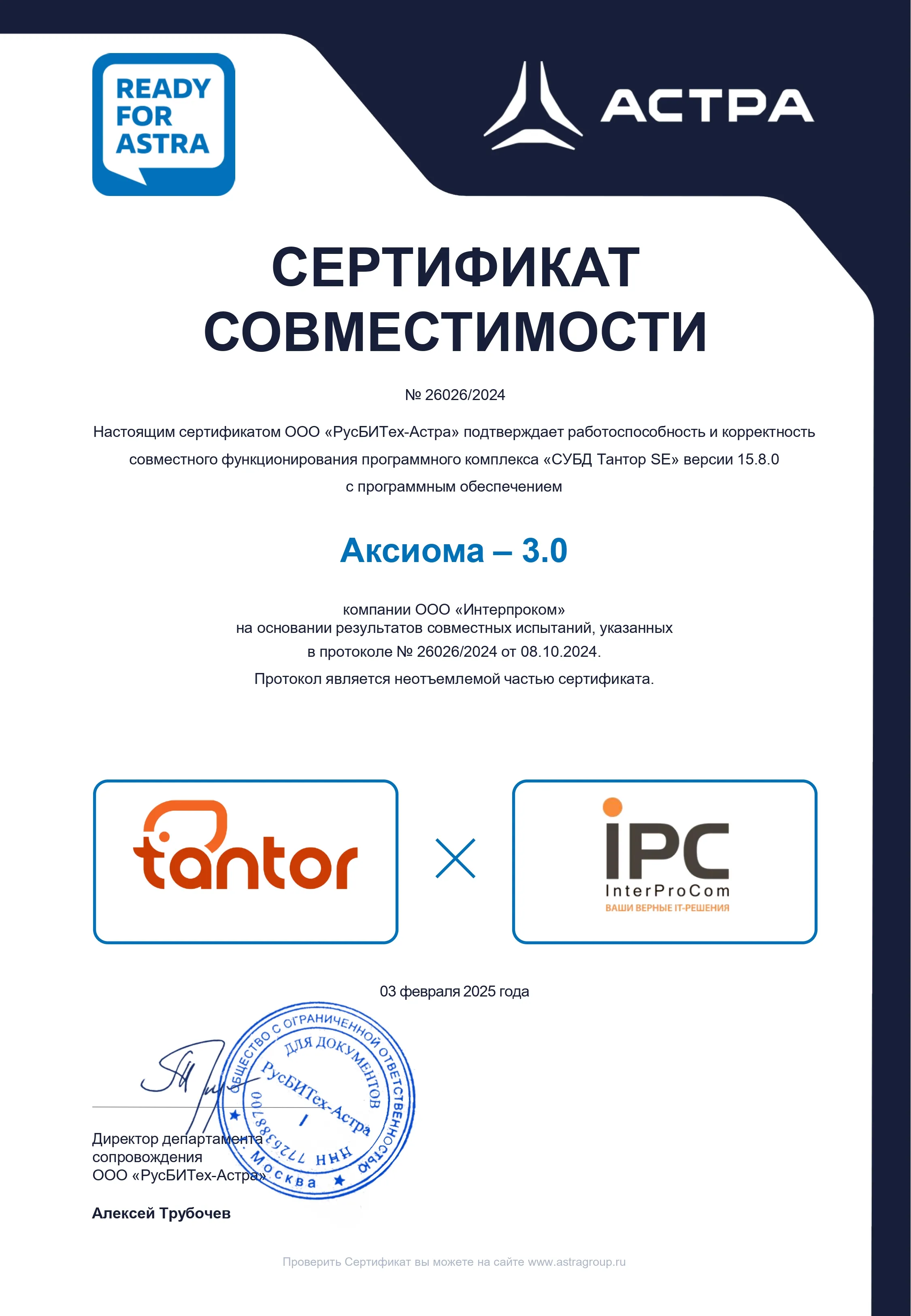 - Технологическая совместимость с отечественными ОС Astra Linux и РЕД ОС, СУБД Postgres Pro и СУБД Tantor SE подтверждена тестами и сертификатами.