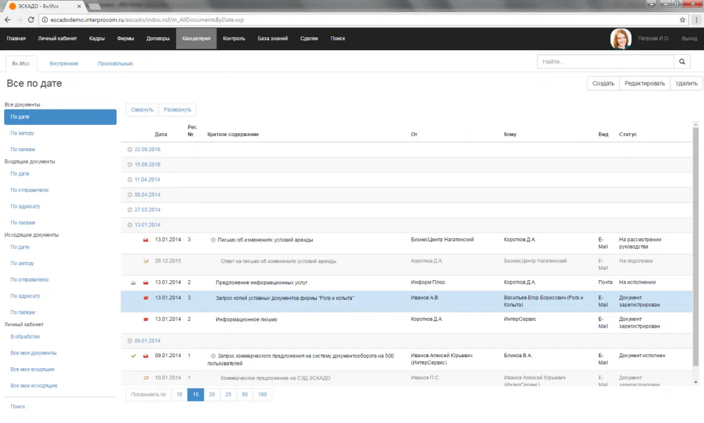 Входящие/Исходящие документы. Представление «По дате регистрации».