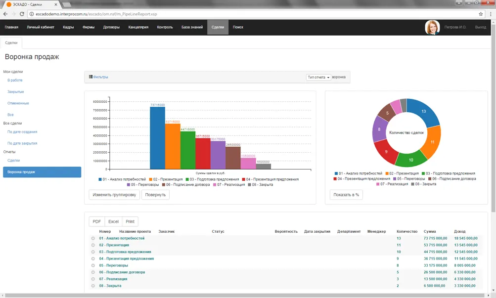 Модуль содержит список сделок по контрагентам, учитывая стадии продаж, сроки проекта, ориентировочную стоимость, вероятность продажи, источник появления сделки и т.д.