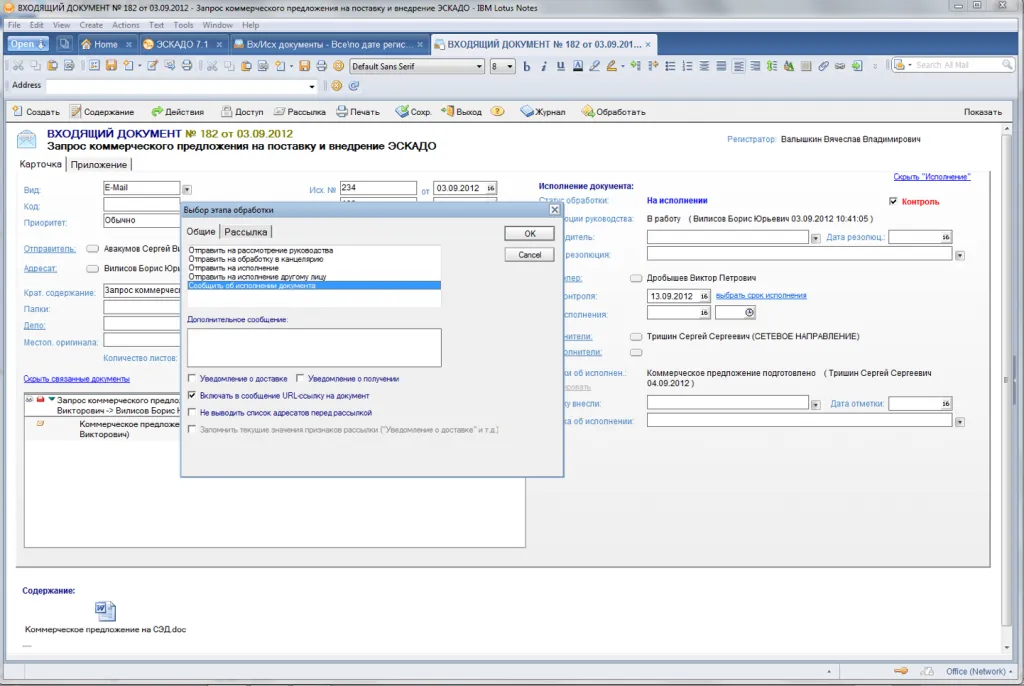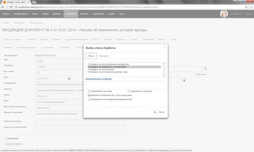 Входящий документ. Выбор этапа обработки документа.