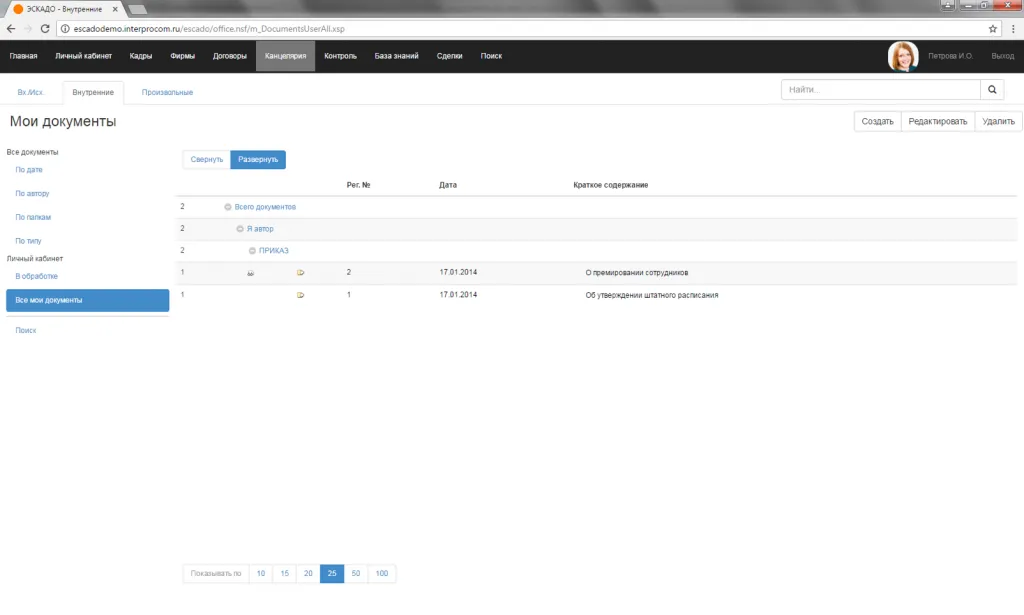 Внутренние документы. Представление «Мои документы».