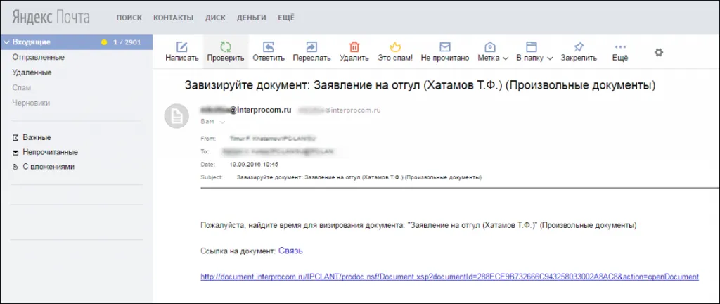 Пример уведомления отправленного на электронную почту