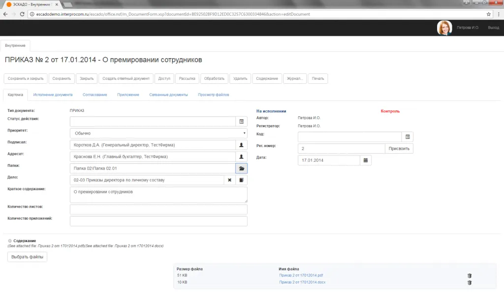 Внутренний документ «Приказ»