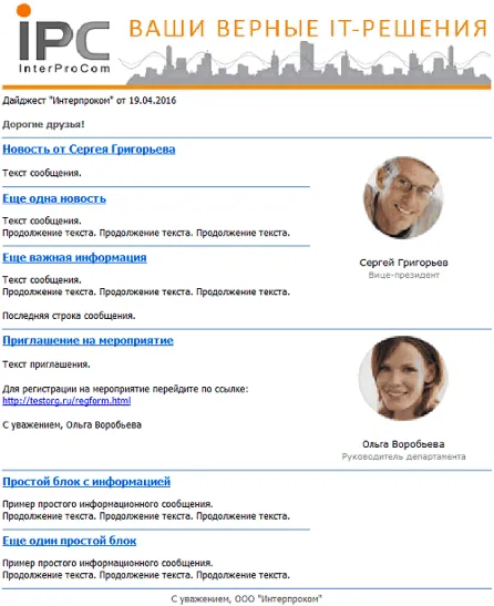 При организации рассылки можно разработать шаблон рассылаемого письма, включающий присоединенные файлы. В тексте письма могут содержаться автоматически запоняемые поля, например – имя адресата, занимаемая должность, название организации и другие, что позволяет проводить персонифицированную рассылку.