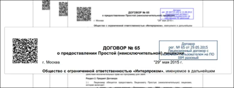 Вставку QR-кода можно использовать, например, для файла с договором перед тем как его распечатать и передать внешней стороне для подписания. После подписания и возвращения договора от внешней стороны вы можете открыть карточку договора просканировав QR-код на бумажном оригинале договора с помощью видеокамеры, подключенной к компьютеру.