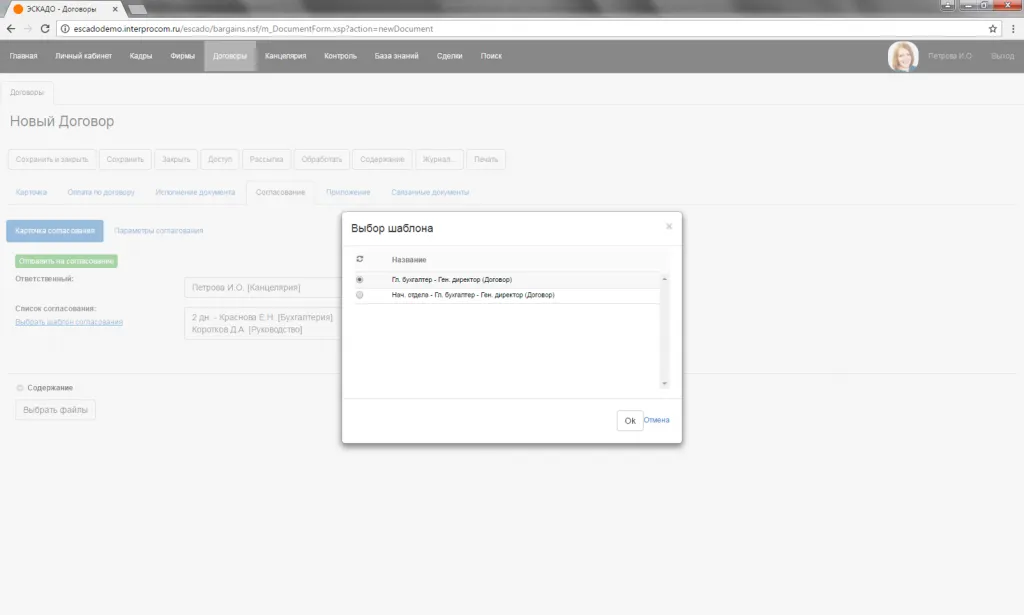Договор. Согласование. Выбор шаблона согласования.
